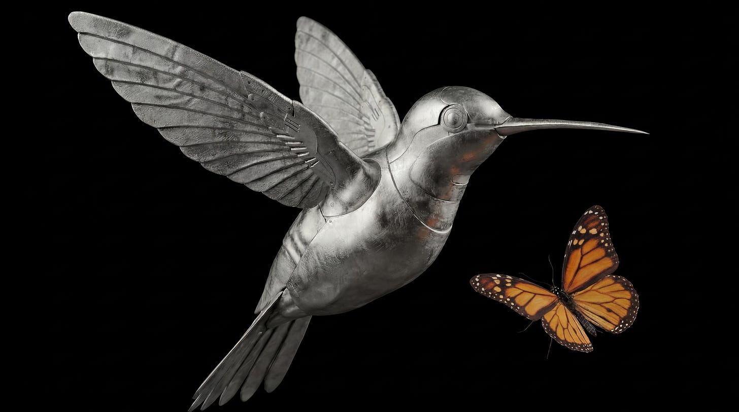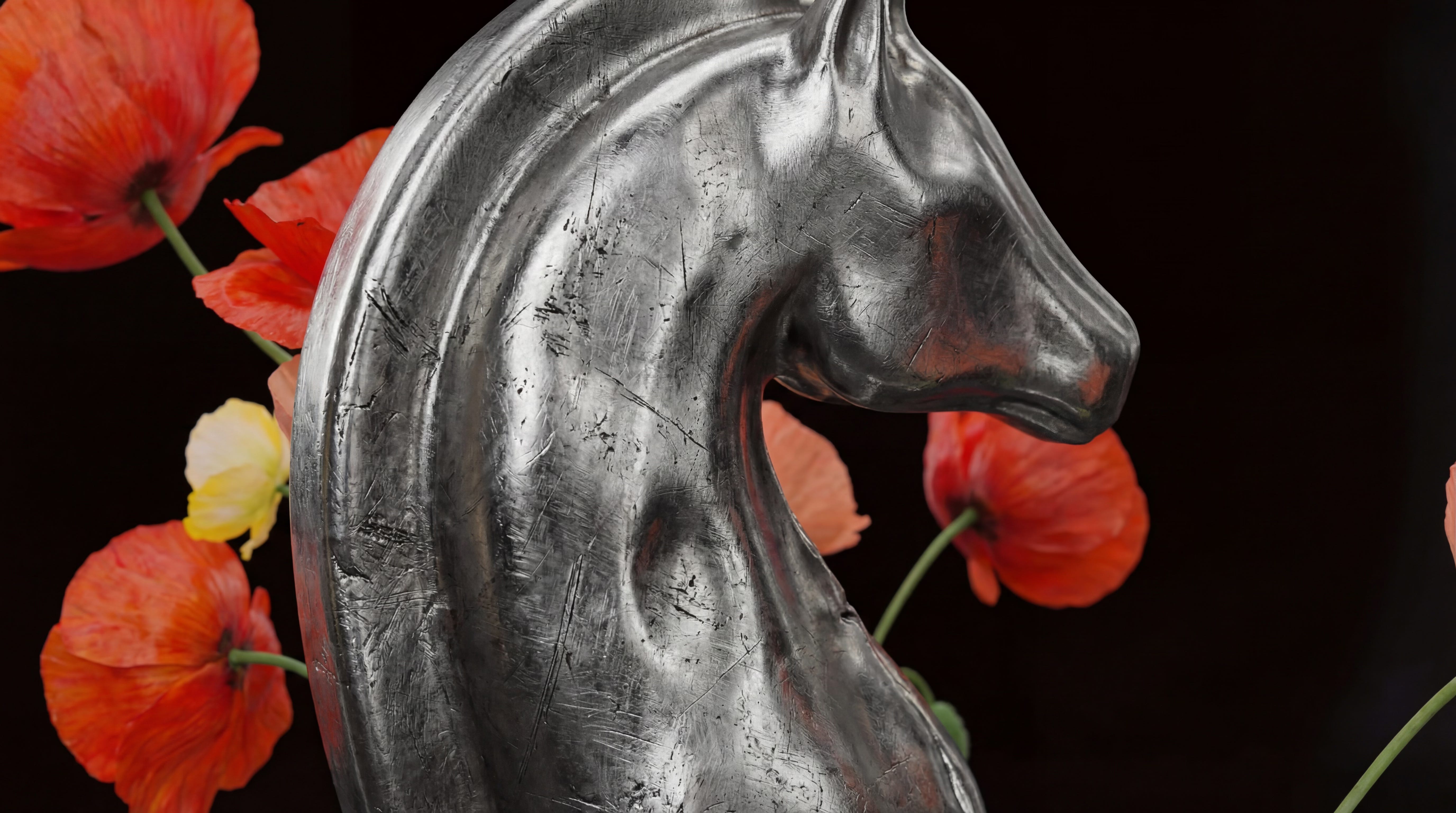 The chrome finish connects everything structural—cursor, chess pieces, hummingbird, the logo itself. Silver with patina, reflective but not pristine. It reads as both technological and ancient. Colour enters the film only through nature: first the red-orange poppies, then the full spectrum, then the blue flowers and the chrome bird together. The colour arc mirrors the narrative arc.