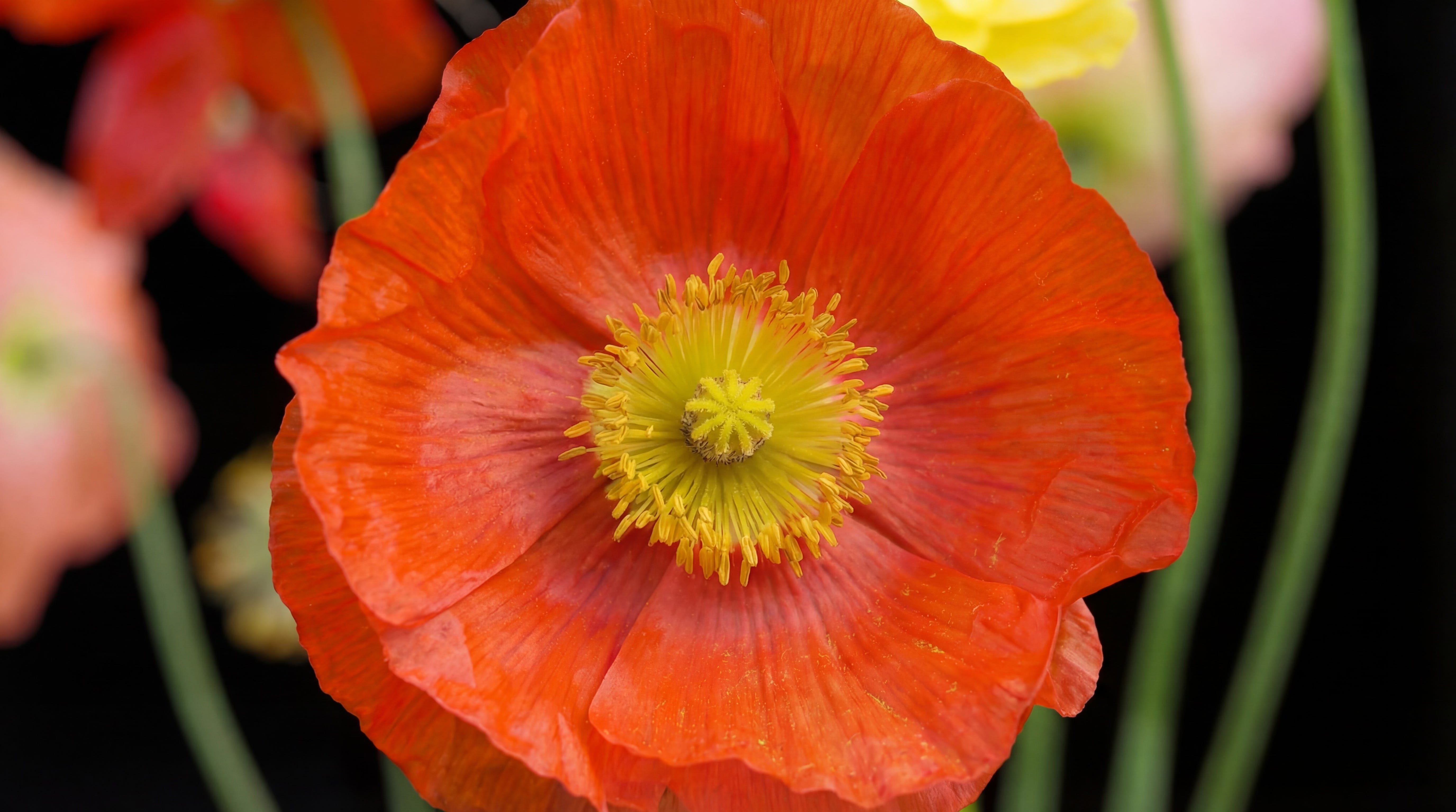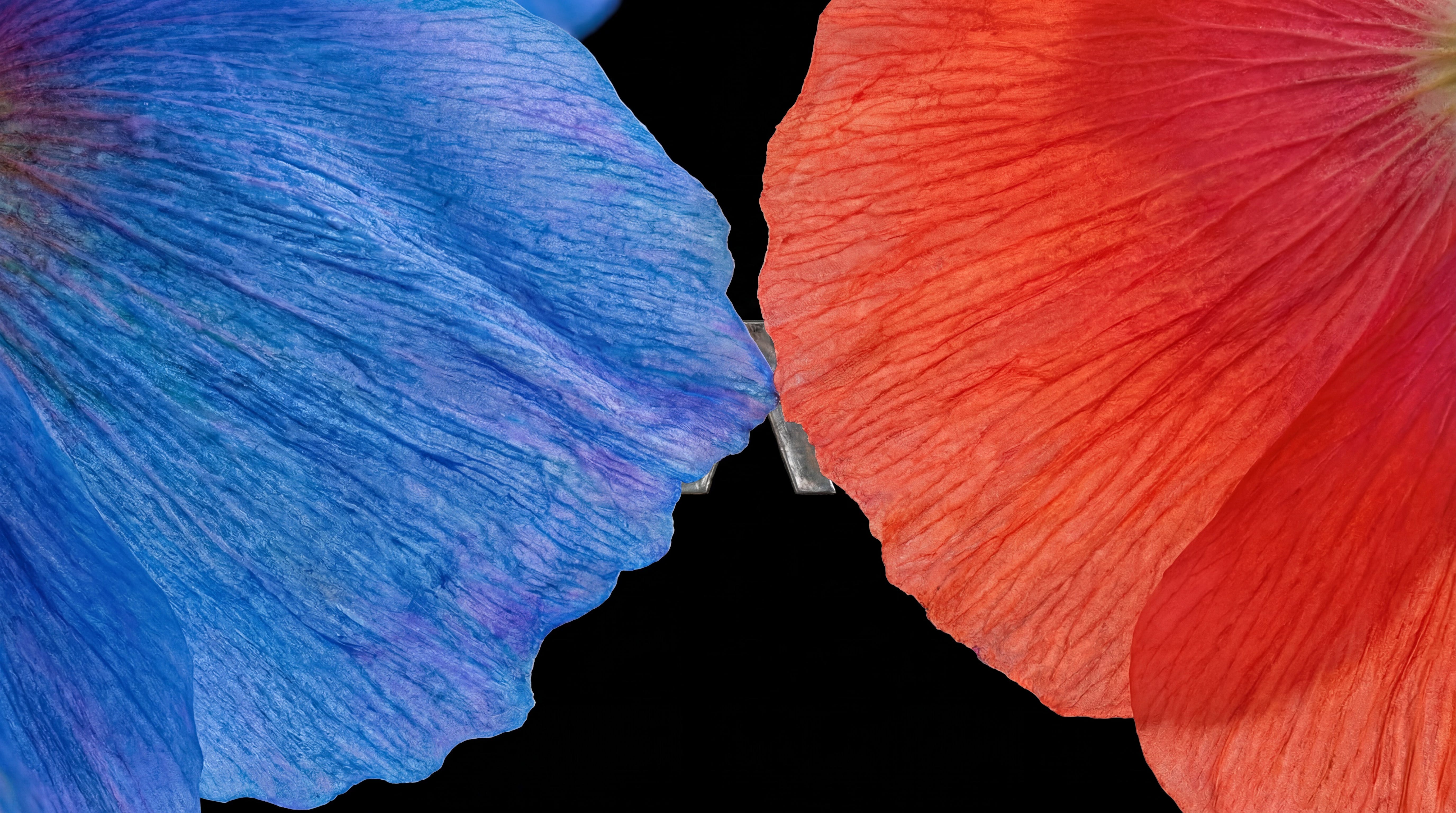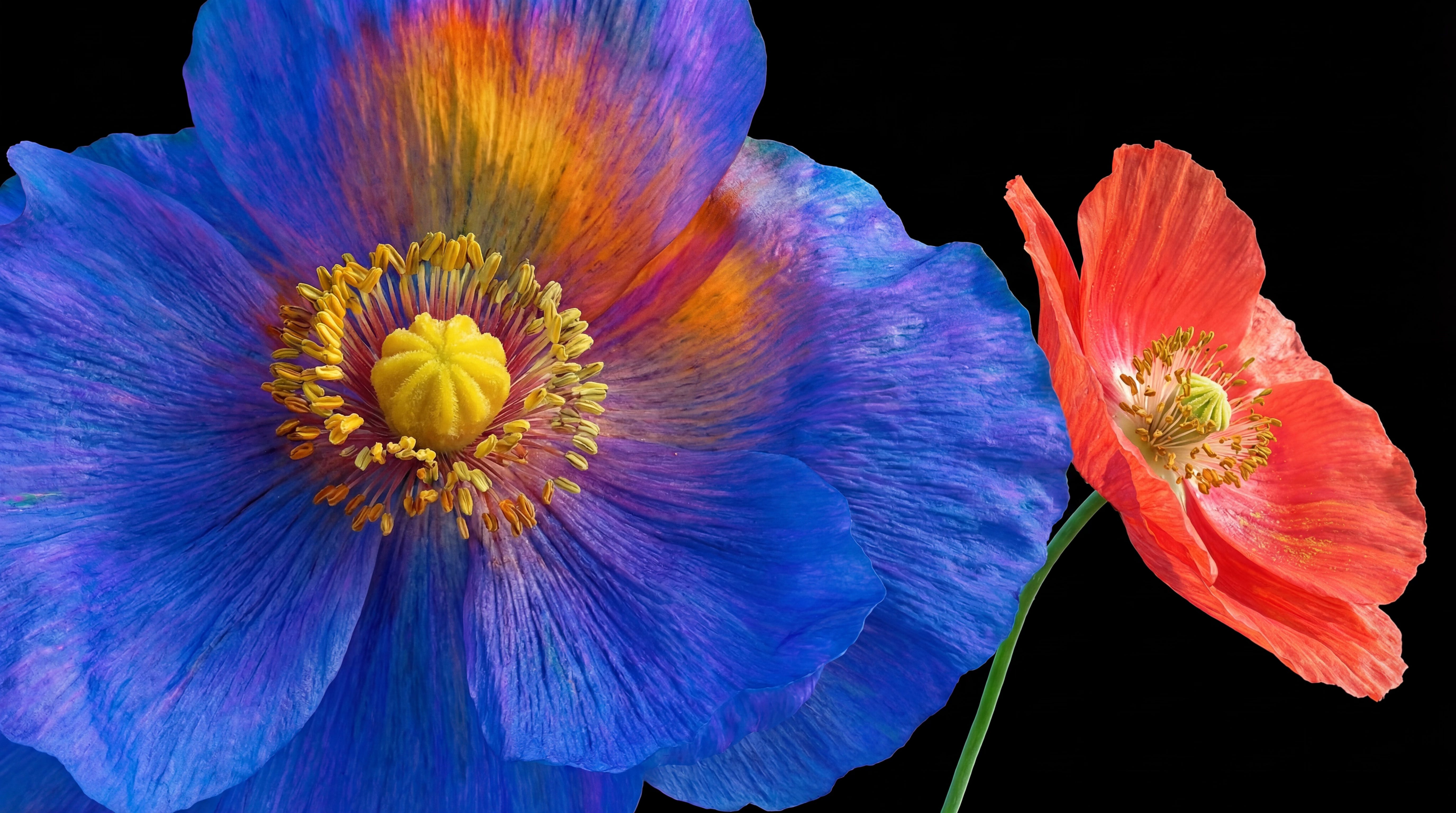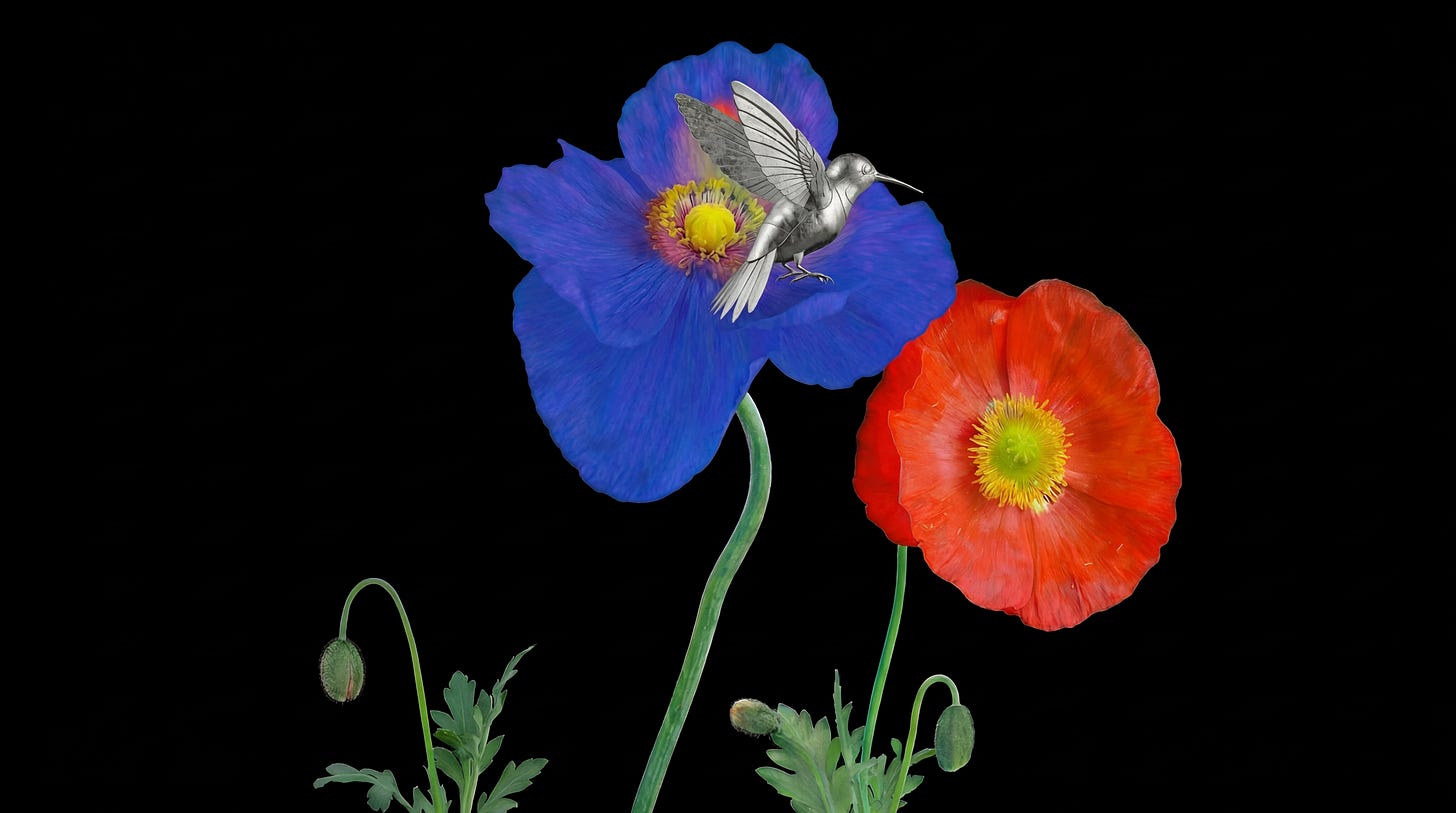 Blue poppies, chrome hummingbird. Colour consumes the frame entirely.