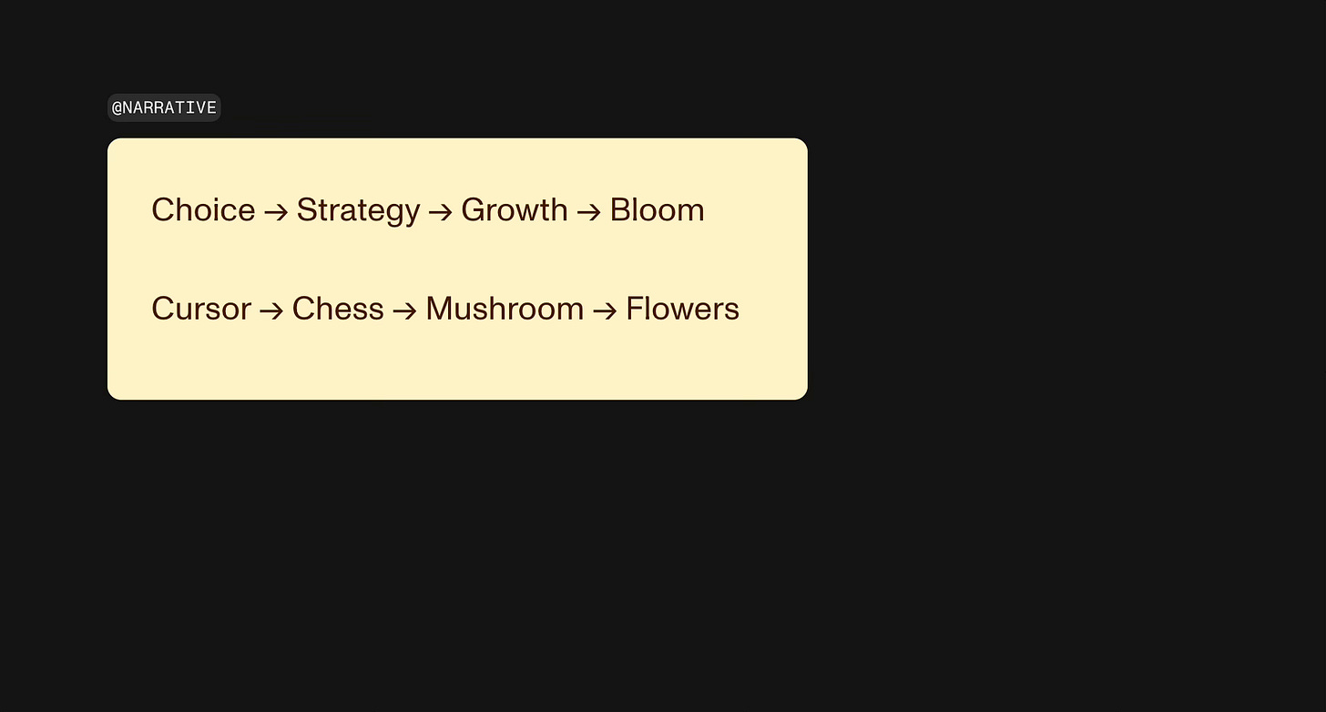 What they didn’t have, and what no brand kit can give you, was the why. Why does a cursor live in the same world as a flower? Why is there a chess piece next to a mushroom? What story are these objects telling? Without that connective logic, the teaser would become what most conference teasers become: pretty elements drifting across a gradient. A screensaver with a logo at the end.