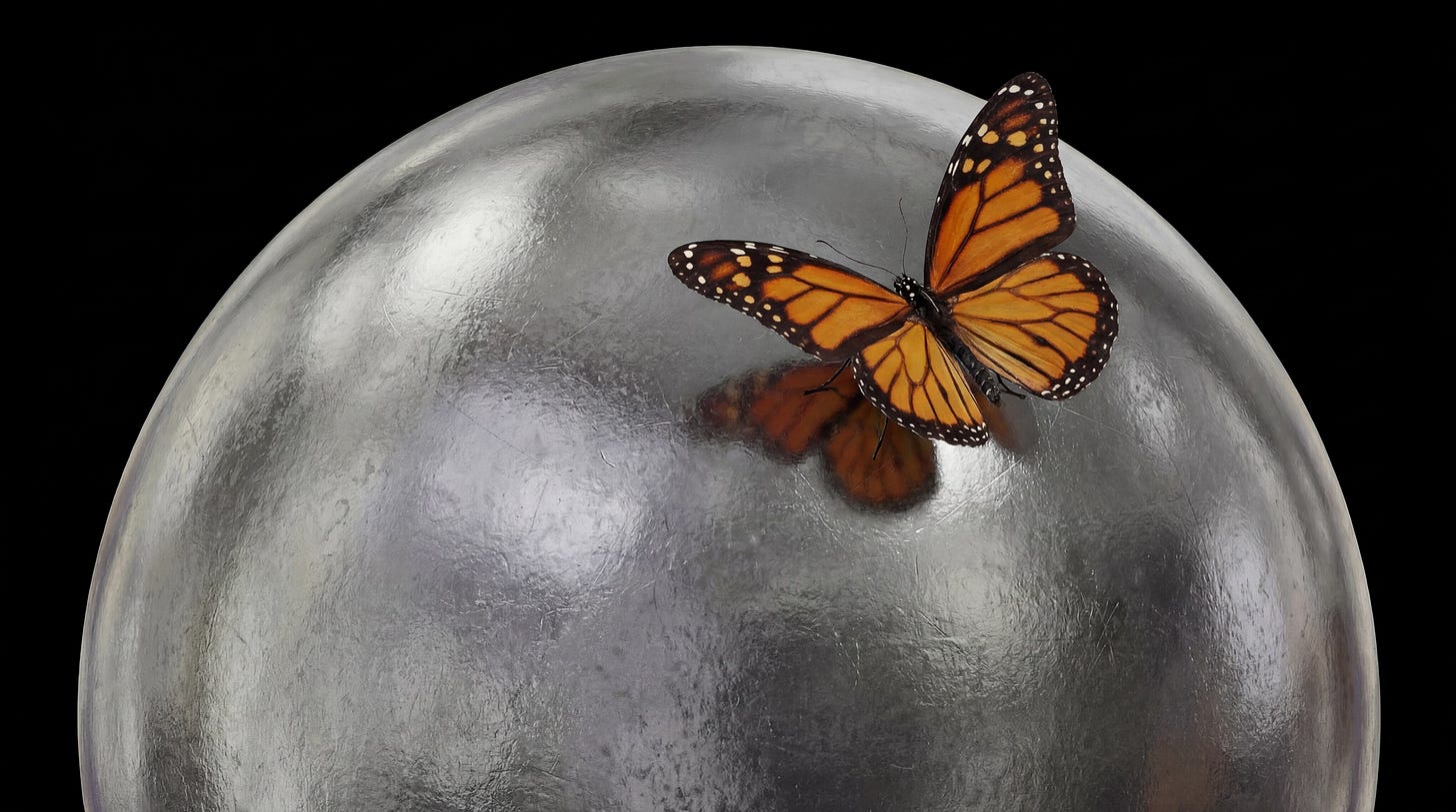 A monarch butterfly lands on a chrome sphere. The word: “connections.” Then the garden explodes.