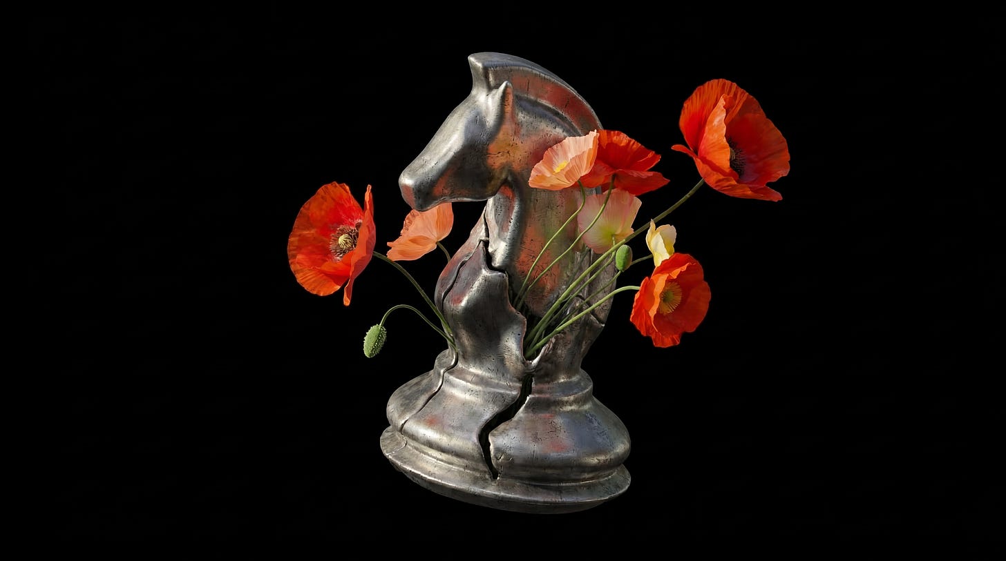 Cursors multiply. The chess knight appears. Then the first flowers press against the chrome, and the text reads: “something shifts.” The organic begins to overtake the geometric.