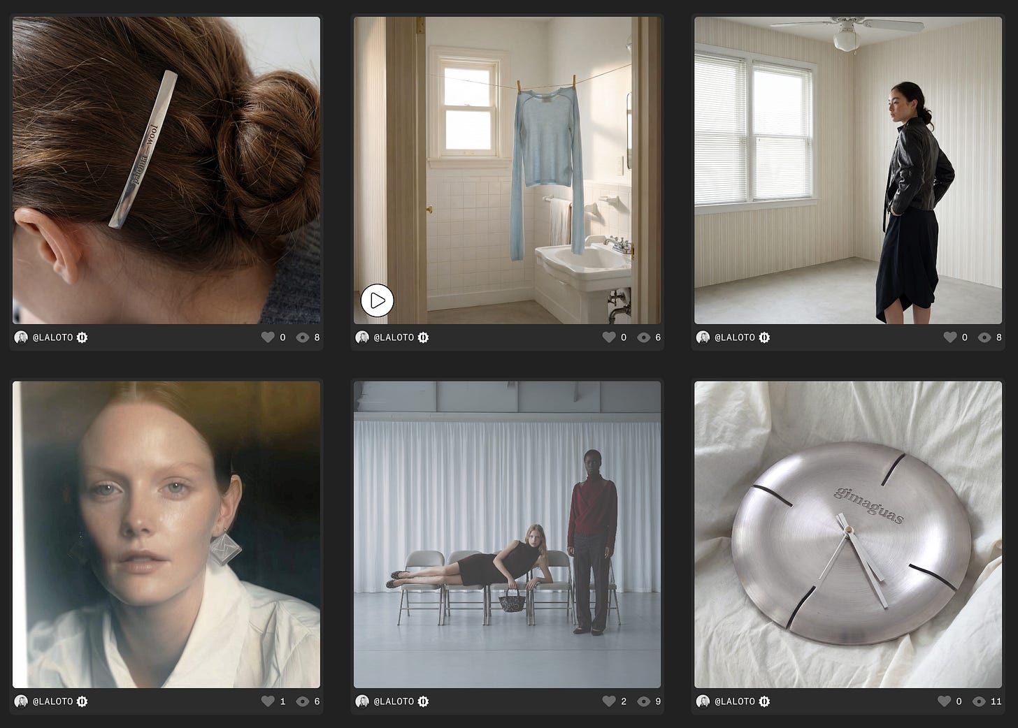 Laura’s images live in a register where nothing raises its voice. They arrive with daylight and restraint. A bathroom with clean tile. A pale blue garment hanging like a note. An empty room with blinds filtering the afternoon. A metallic object on wrinkled sheets. Hair pinned with a clip that feels more like a tool than decoration…
