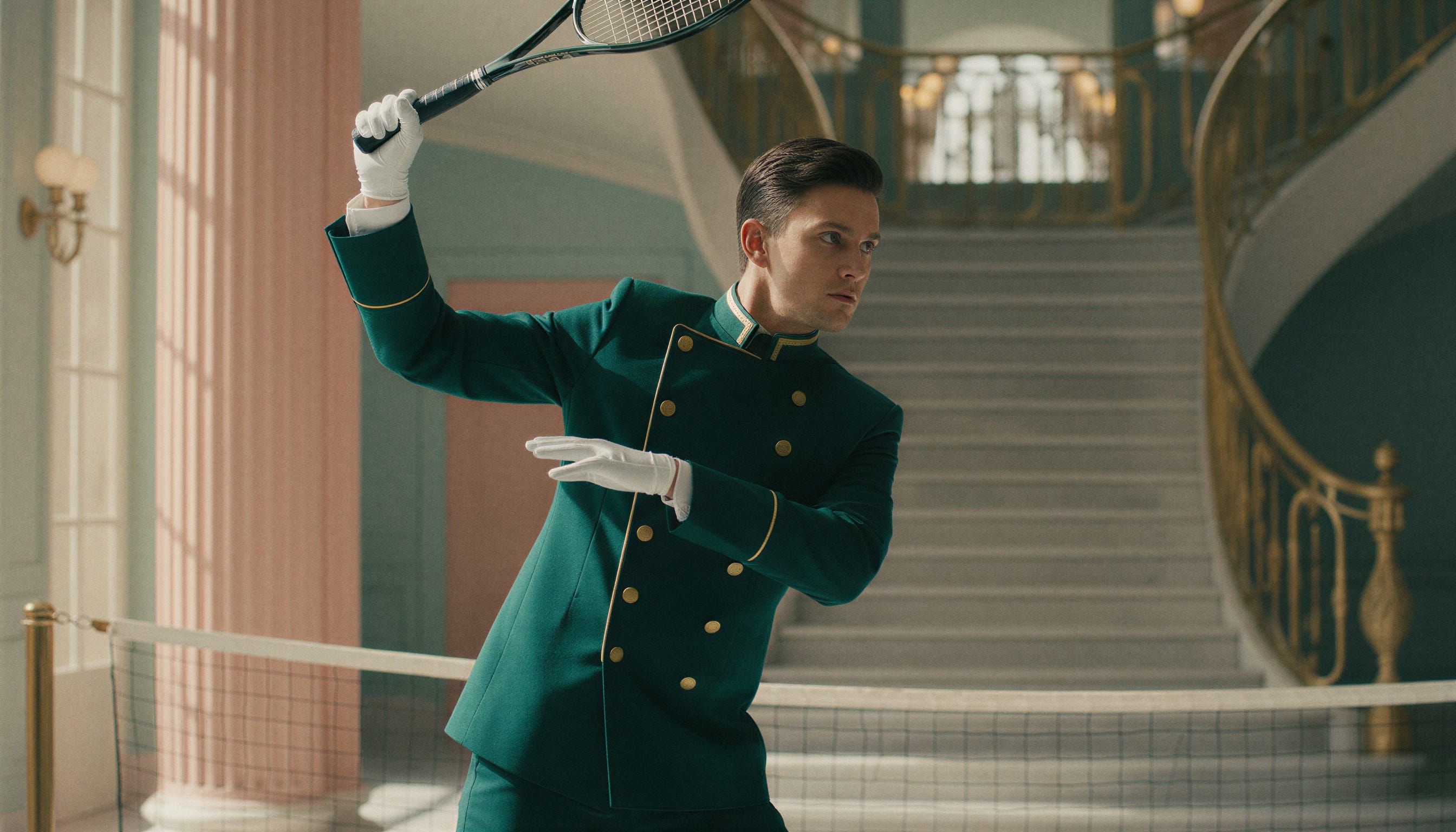 Every element followed hotel logic: signage, uniforms, printed matter, corridors, thresholds, rooms, gestures, object handling.