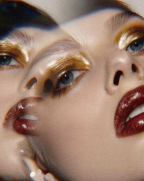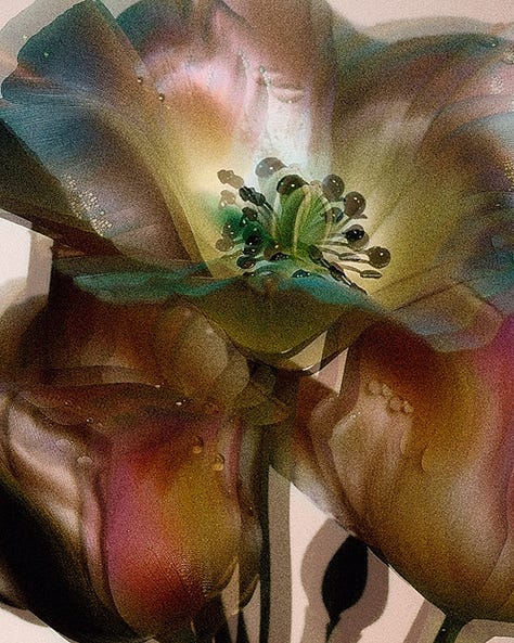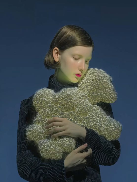 Marina Perunkova stitches light to skin. In her AI-native portraits, faces bloom and recede like afterimages; petals, veils, ghosted frames. The human signal, multiplied. Never ornamental, always precise. She choreographs blur as dramaturgy: a red flare crosses the cheek; a flower unfurls over breath; a body armors itself in cellular knit, tender and alien. Fashion becomes interface. Memory, a lens.