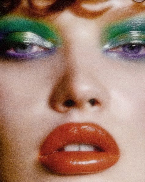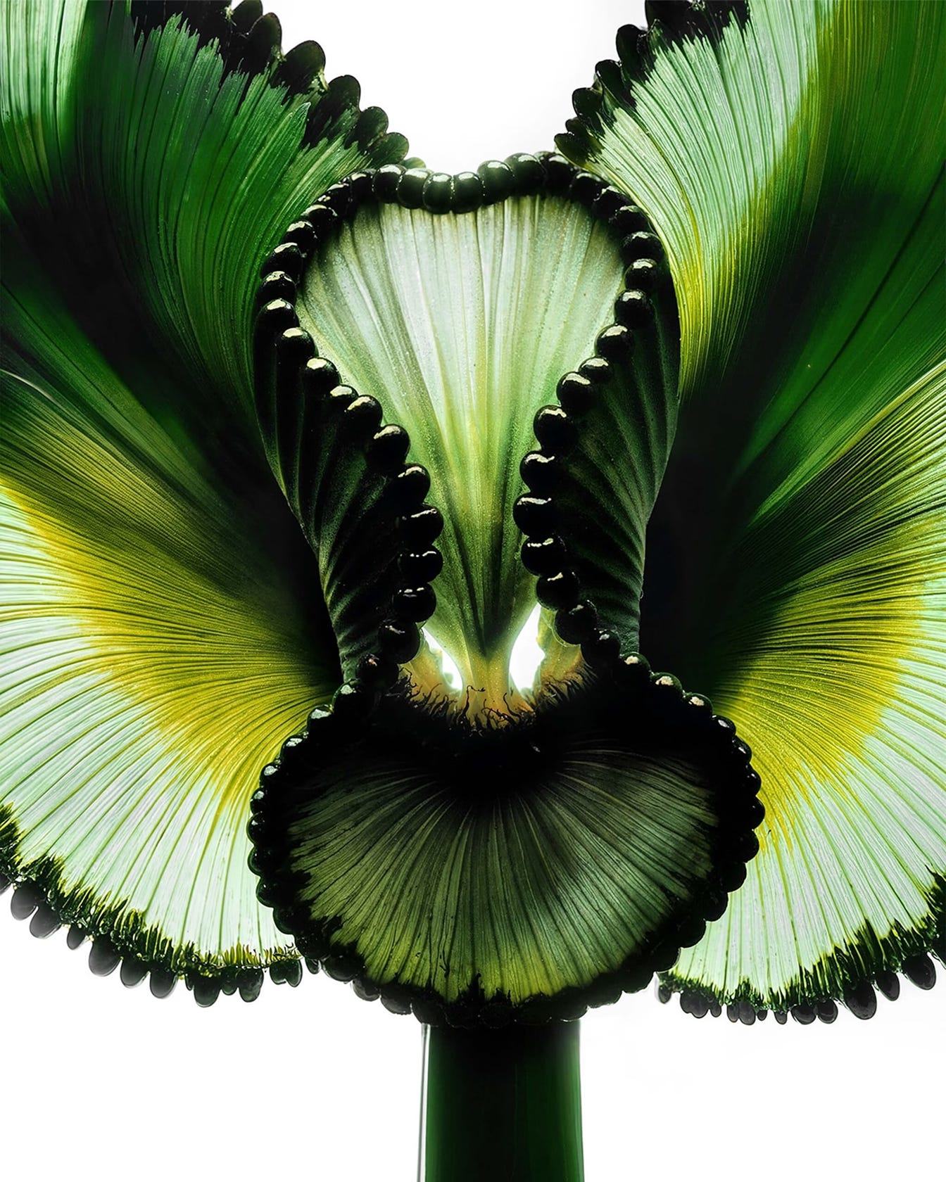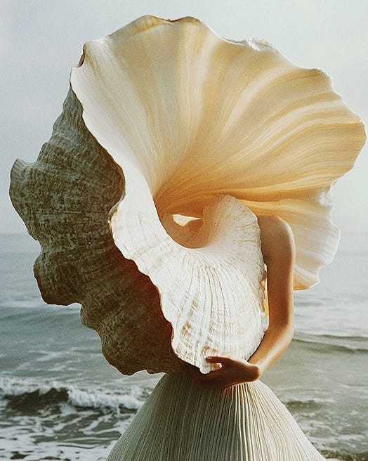 AiSee works where the eye meets the tide and fashion learns a new grammar. In one frame, a body carries a monumental shell—part headdress, part acoustic chamber—turning a shoreline into sculpture. Another blurs a swimmer against a totem of cloud: focus withheld, memory sharpened. Beauty studies split the gaze into prisms; metallic lids and lacquered lips refract like glass, while a portrait in chartreuse and soft fur reads couture-botanical—tactile, editorial, exact. Then the macro: chlorophyll architectures lit from within, ribbed and pleated like haute textiles, half-plant, half-engineered organ.