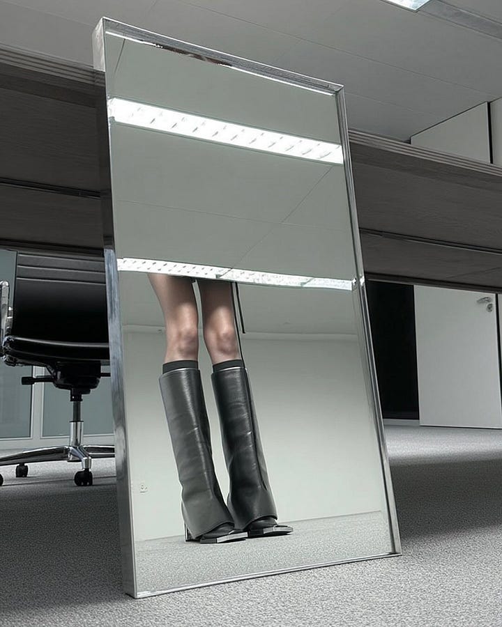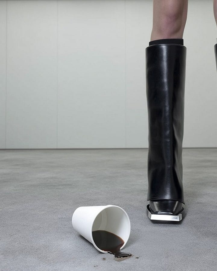 Crops are assertive and semiotic. The back-of-head with a child’s hand converts tenderness into composition; the mirror that deletes the torso turns boots into architecture; the coffee spill operates as a kinetic still life. Human–animal adjacency reads as kinship study rather than spectacle, the shared profile closing the gap between portrait and product.