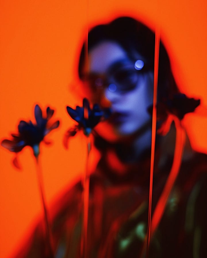 We read Marina Embrace through color, surface, and staging. Her palette locks into high-voltage oppositions; vermilion grounds versus cobalt skin, onyx latex against bone tones; producing heat and a calibrated sense of threat. Blur is structural, not cosmetic: faces withheld, edges softened, intention sharpened. Identity turns into silhouette and temperature.
