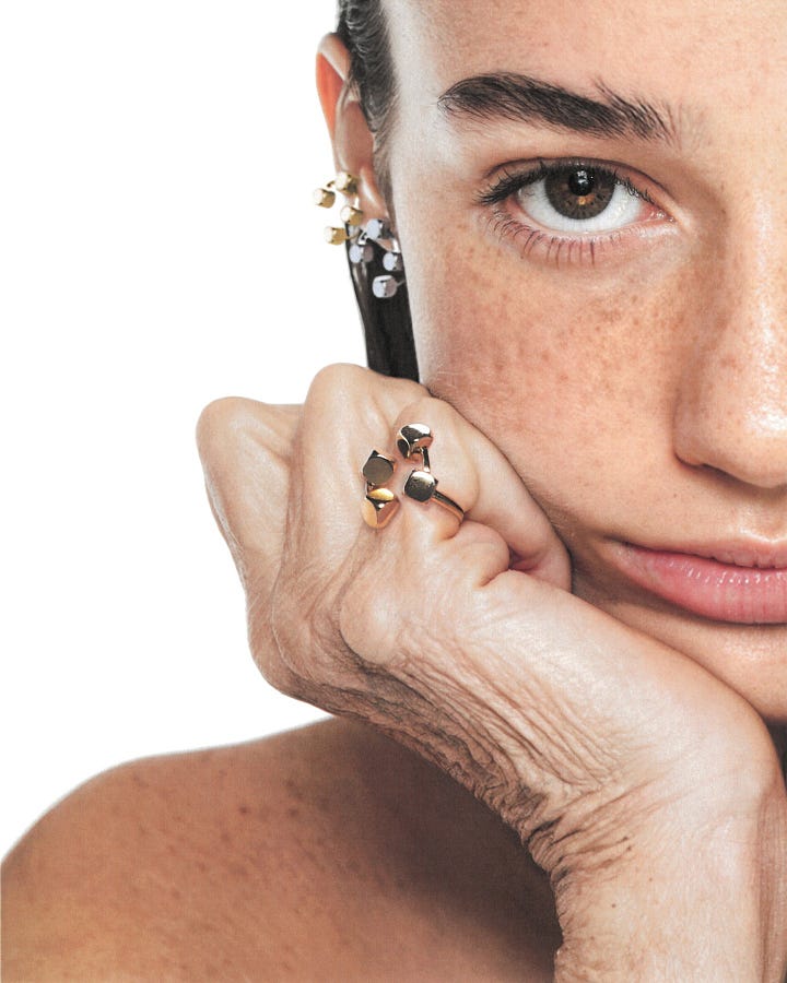 A recurring strategy is material dissonance. Soft against hard, organic against engineered: a snake tracing a domestic carpet, a marble face wedged in rock, a delicate textile treated like a fossil. Even the cloud spiral behaves like sculpture, a sky rendered as object. The palette stays cool; graphite, ivory, muted blush, so any metallic glint or rouge lip becomes a signal, not noise.