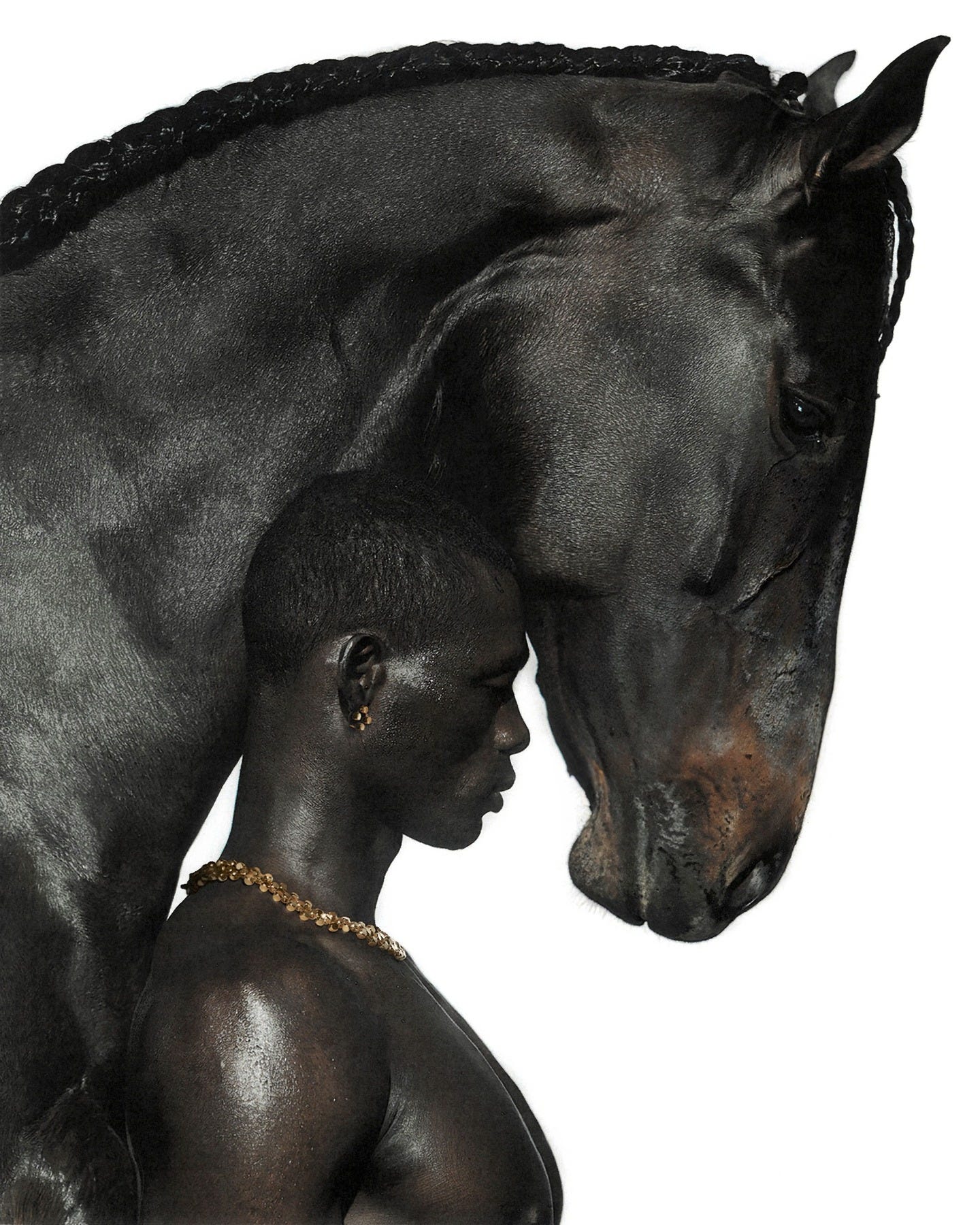 UNVEIL builds images as precise arguments about material, body and symbol. Surfaces carry the plot: wet skin, braided mane, chrome chain, patent leather, ceramic glaze, carpet pile. Light is surgical; flashy enough to lift specular highlights yet tempered so mid-tones hold. Backgrounds default to clinical whites or office greys that neutralize time and convert the scene into a display system.