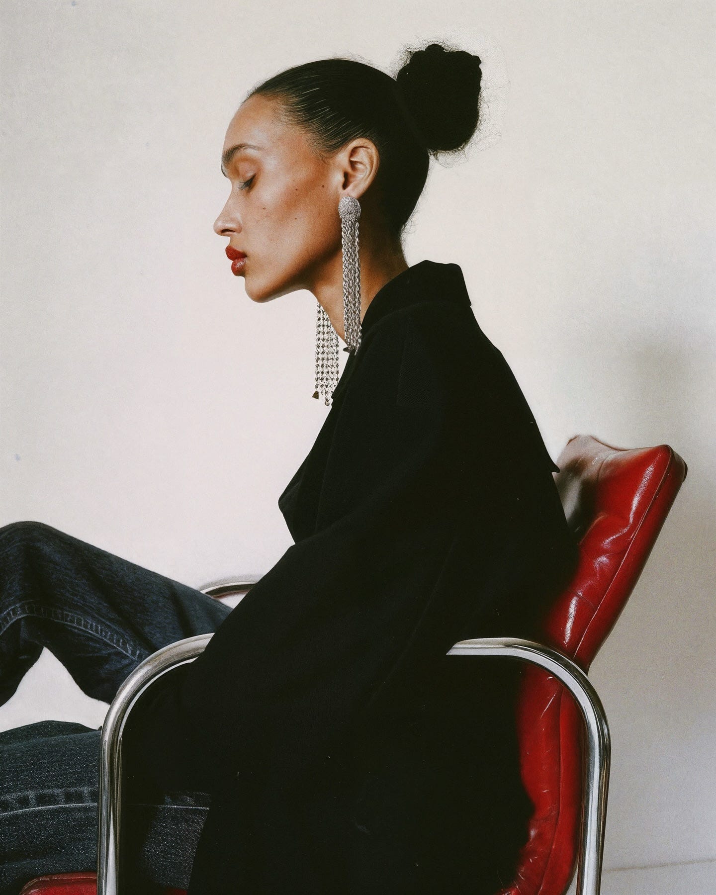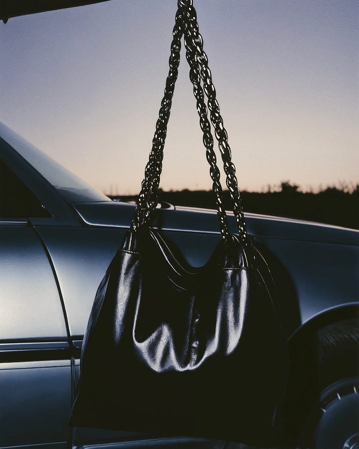 Lighting carries the argument. Specular highlights skate across patent fabrics and chain, mapping power onto texture. In the handbag-at-dusk image, twilight compresses to a single value range; the chrome reads like punctuation, the bag like a protagonist. Elsewhere, deep shadow and narrow beams sculpt torsos into near-monuments, recalling studio portraiture while staying firmly editorial.