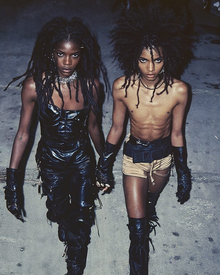 Gesture is minimal and precise. A tilt of the head; hair extended as a vector; two figures advancing with direct gaze. Clothes behave as armor, then as skin. The images often hold at the edge of erotic charge yet remain controlled; fashion rhetoric without cliché.