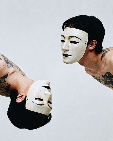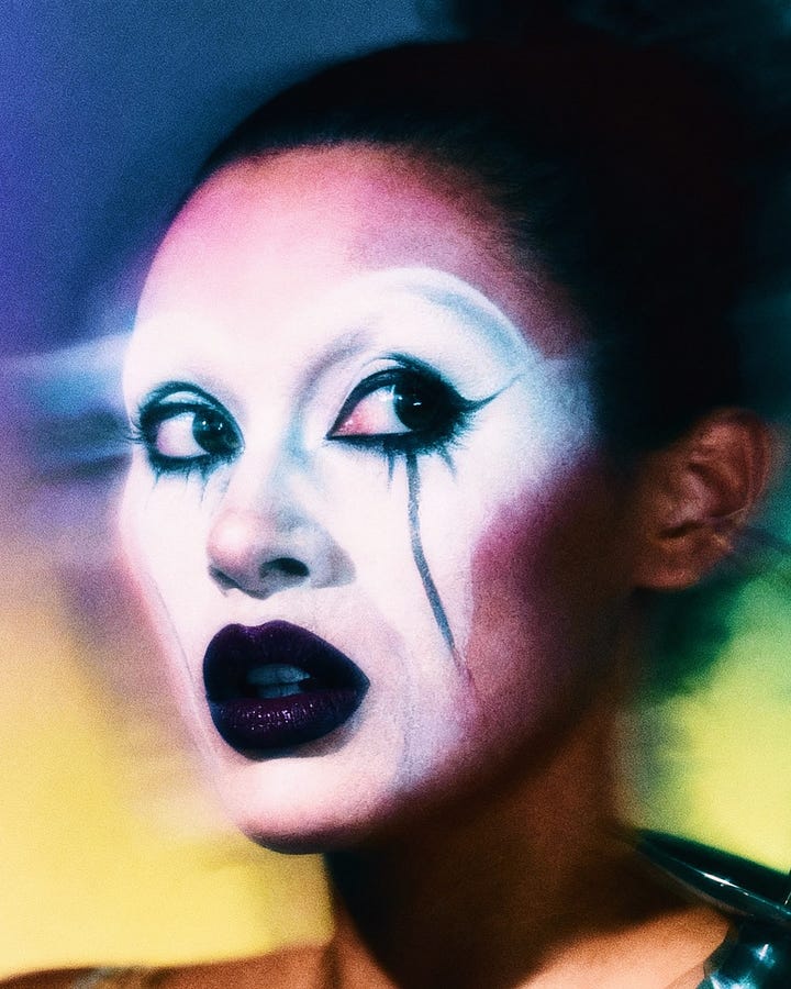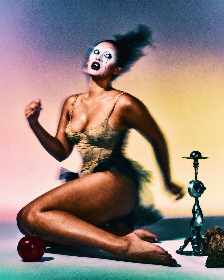Melissa Diago’s practice operates at the threshold where the body refuses docility; where drag’s theatrical armature meets latent-space negotiation. Here, gradient skies flatten into studio ground, defiance incarnate against atmospheres that shift from cerulean to ochre with the logic of memory rather than meteorology. Ink sprawls across skin: a lexicon authored before the model, persisting through every synthetic iteration. The gaze is frontal, unapologetic; less performance than territorial claim.