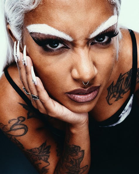 What distinguishes this work is its command of surface. Reflective floors bend into liquid chrome ribbons, yet tactility remains legible: the wet gloss of latex, the matte drag of cigarette paper, nails filed into calcified weapons. Background grain operates didactically, a chosen texture rather than artifact, framing each figure within a haze reminiscent of analog fashion editorials shot through gauze.