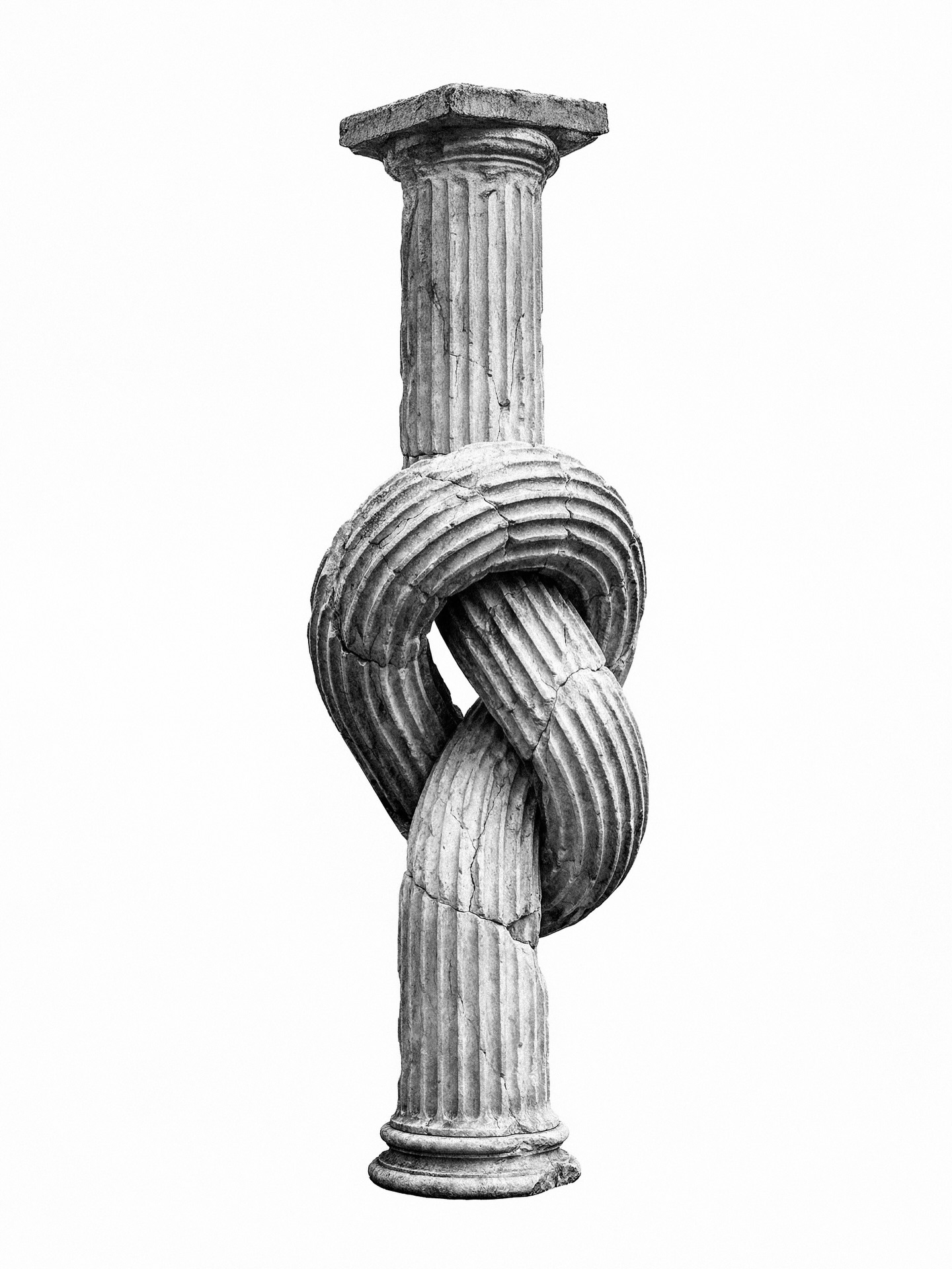 The biographical substrate matters here. Loss and disruption in childhood produce not merely themes but a formal logic: the fragmented portrait, the house unmoored from ground, the knotted column that refuses classical stability. These are images of dislocation rendered through what Wallinger terms “promptography”; a practice that positions the artist as interlocutor rather than sovereign creator, coaxing forms from the latent space of trained models.