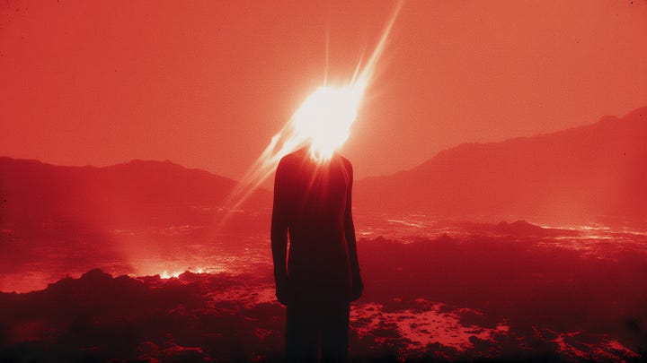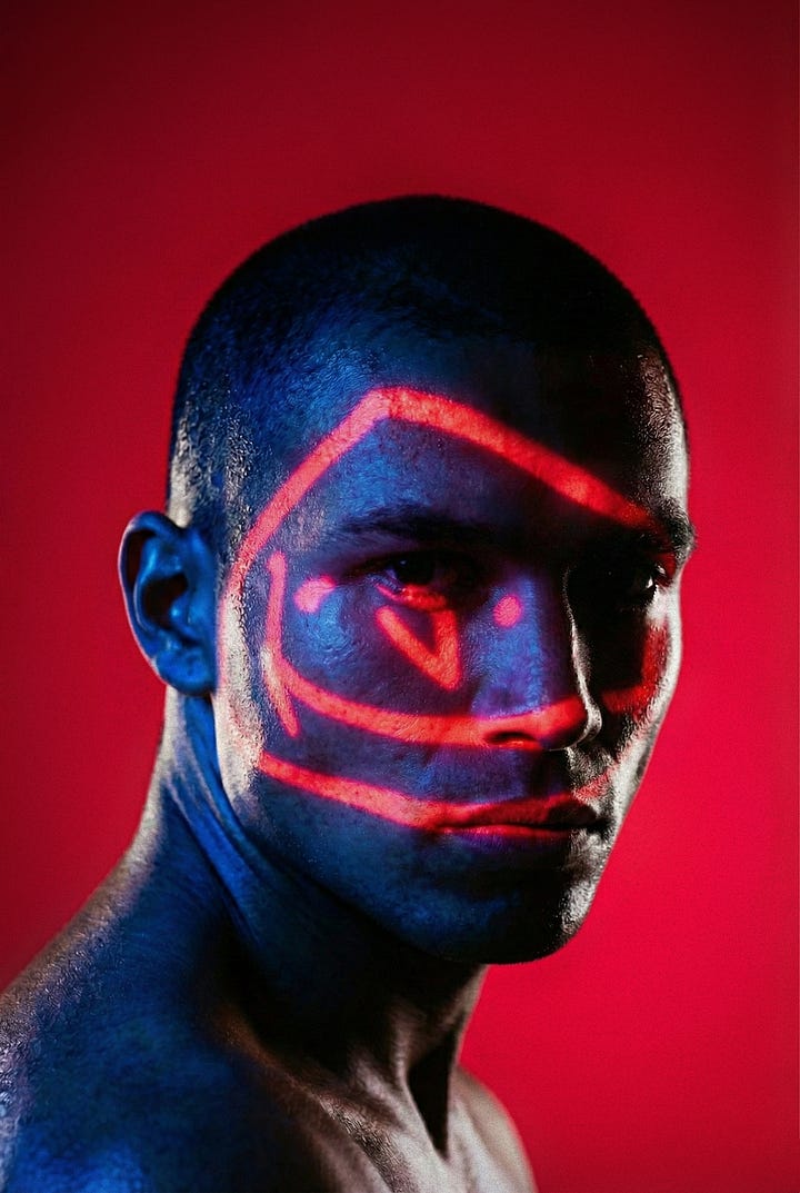 The images present a taxonomy of contemporary subjectivity: the figure isolated against twilight landscapes, faces transformed by light-projected geometries, bodies situated within architectures both natural and constructed. There’s a persistent attention to liminality; dawn and dusk, mountain peaks and oceanic horizons, interior and exterior spaces; suggesting an investigation into transitions rather than states. The aesthetic vocabulary draws from fashion photography, conceptual portraiture, and surrealist staging, yet the AI’s interpretation introduces subtle distortions that mark these as products of generative logic.