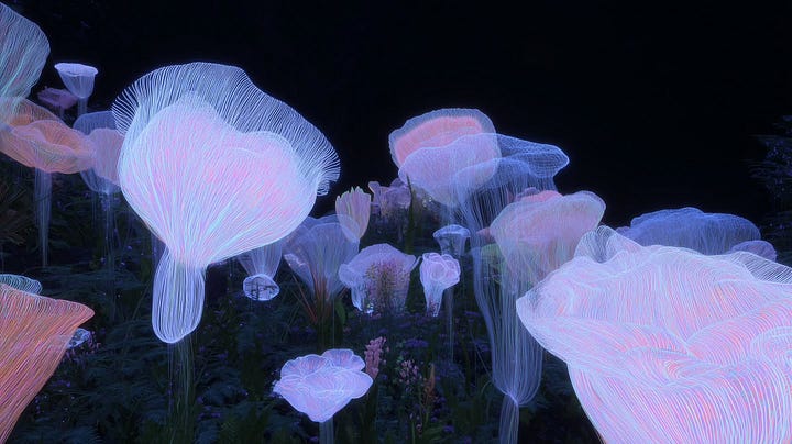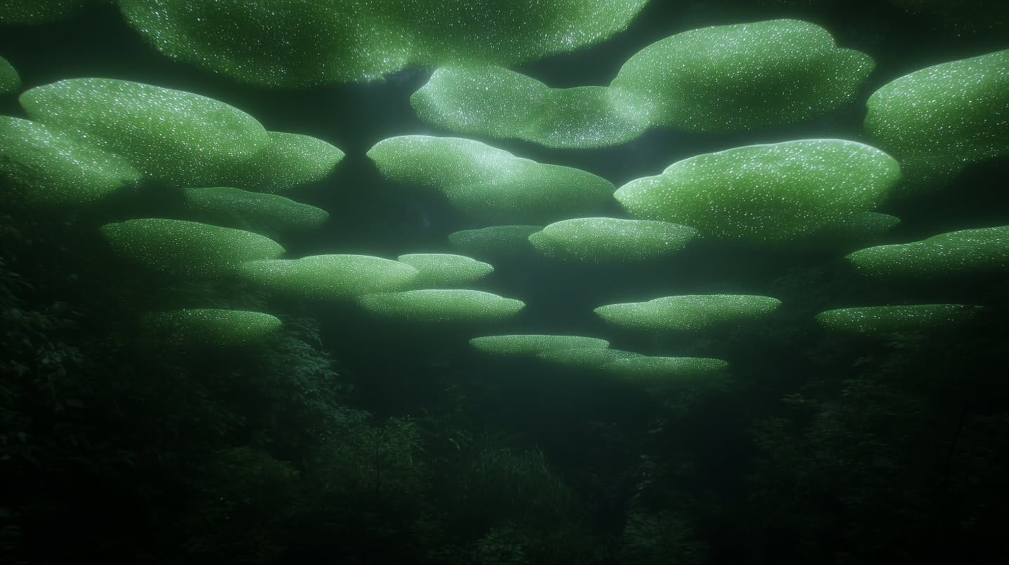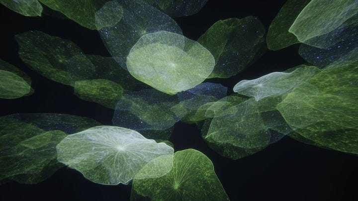 Since beginning her practice with generative tools in November 2024, Jang has positioned AI not as neutral instrument but as collaborator in phenomenological inquiry. The flowers she generates; spectral blues, translucent pinks, submerged greens; hover between biological memory and computational hallucination. They are neither natural nor entirely synthetic. This ontological ambiguity is the work’s conceptual core: can emotion genuinely pass between human consciousness and machine logic, or does the interface itself constitute a new affective territory?