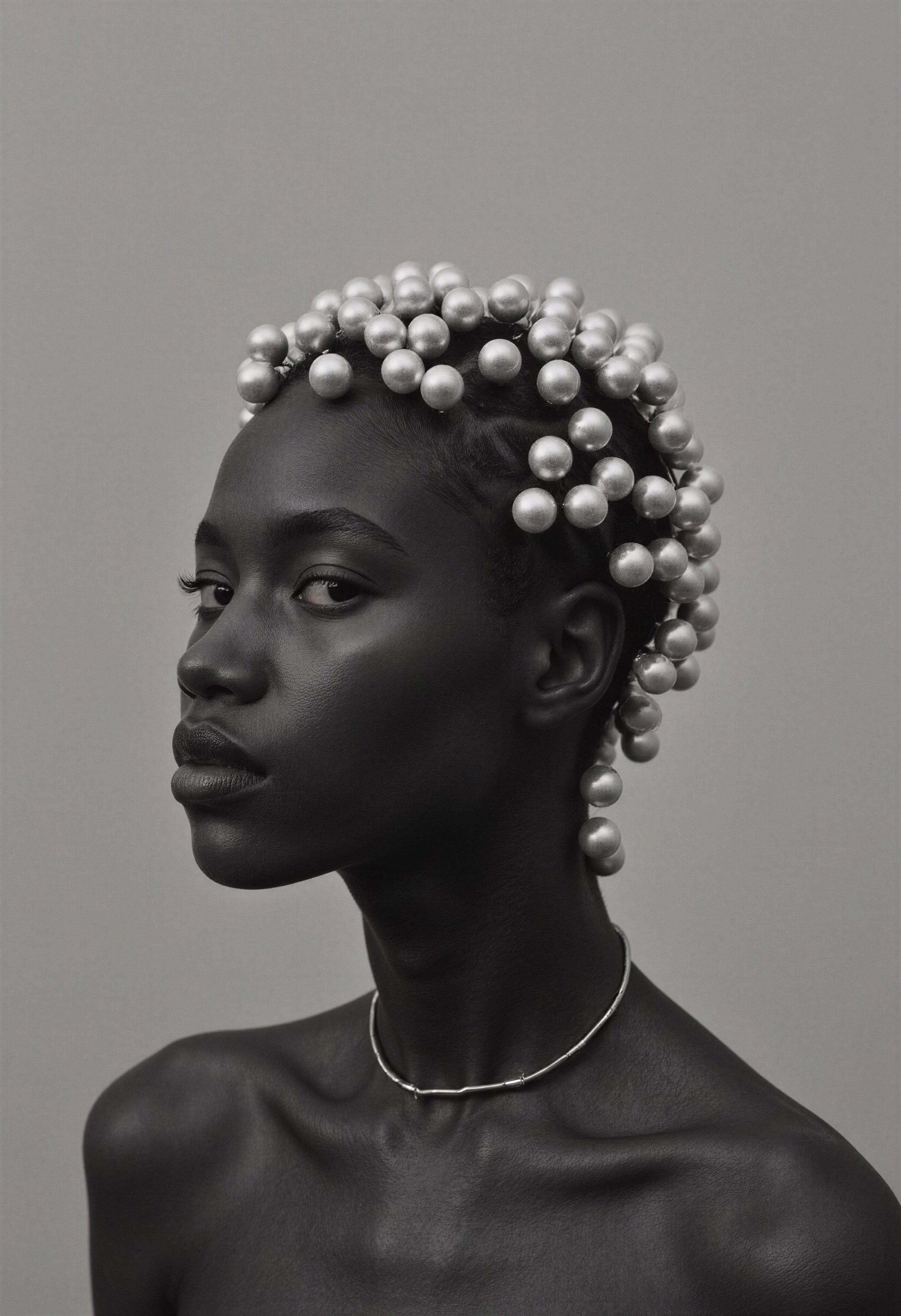 The work resists the smooth surfaces that generative systems so readily produce. What appears across these images is a sustained engagement with the body as contested material: adorned, obscured, abstracted. Pearls become sculptural halos, fabric warps into geometric armor, organic forms collide with synthetic gesture. There’s a volatility here—an insistence on strangeness over legibility. Carballo is working through the tensions between control and surprise, authorship and algorithm, beauty and its deliberate undoing.
