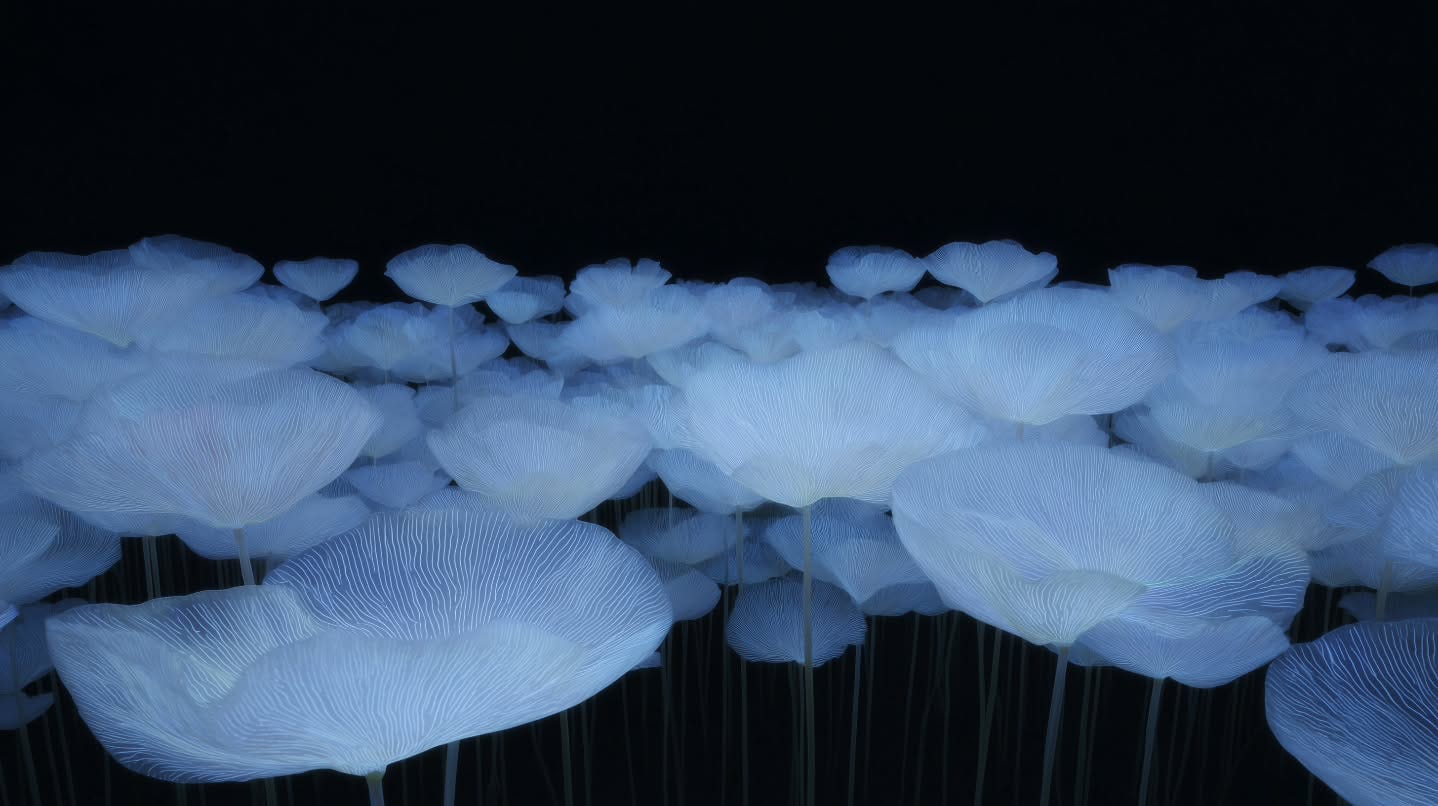In the work of Jang Yeonjeong, botanical forms dissolve into luminous fields where figuration becomes a question rather than an answer. Her AI-generated flora; rendered with wireframe precision against void-like backgrounds; exist at the threshold where the digital sublime meets Korean aesthetic traditions of yohbaek (餘白), the pregnant emptiness that structures classical painting. But these are not nostalgic gestures. The algorithmic rendering exposes light as texture, as fibrous matter rather than metaphysical presence. What appears ethereal reveals itself as constructed; each petal a mesh of iterative calculations.