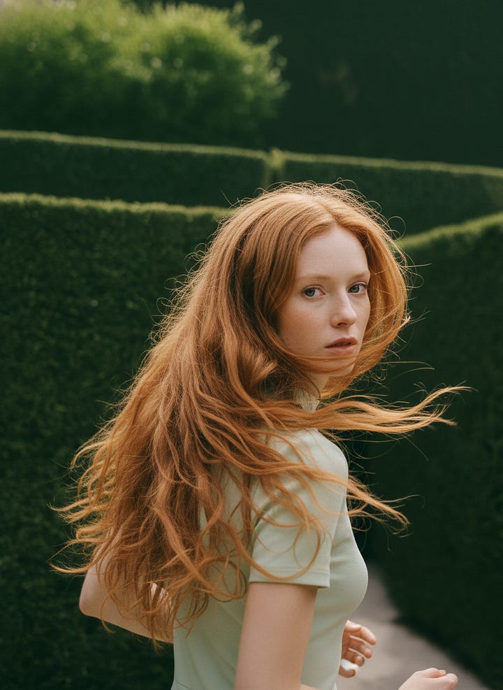 The palette carries it all quietly: deep greens against milk and mint, copper hair as a recurring brand accent, golden-hour warmth with contained contrast. Organic, but curated to the point of becoming architectural. The garden is not wild, it is ordered, almost ritualistic. Nature domesticated into elegance.