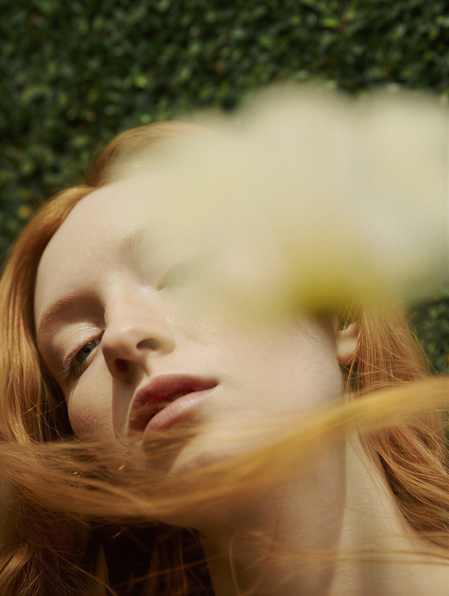 Movement is her primary narrative tool — not action, but choreography. Hair lifted by wind, a body mid-rotation, a soft blur across a face before the camera settles. These are not fashion poses; they are states. The figure is always in something — thought, motion, a private moment that the image catches without disturbing. Selective focus and occlusion do the rest: branches, hair, diffused foregrounds that ask you to look through rather than at. Intimacy is constructed through obstruction.