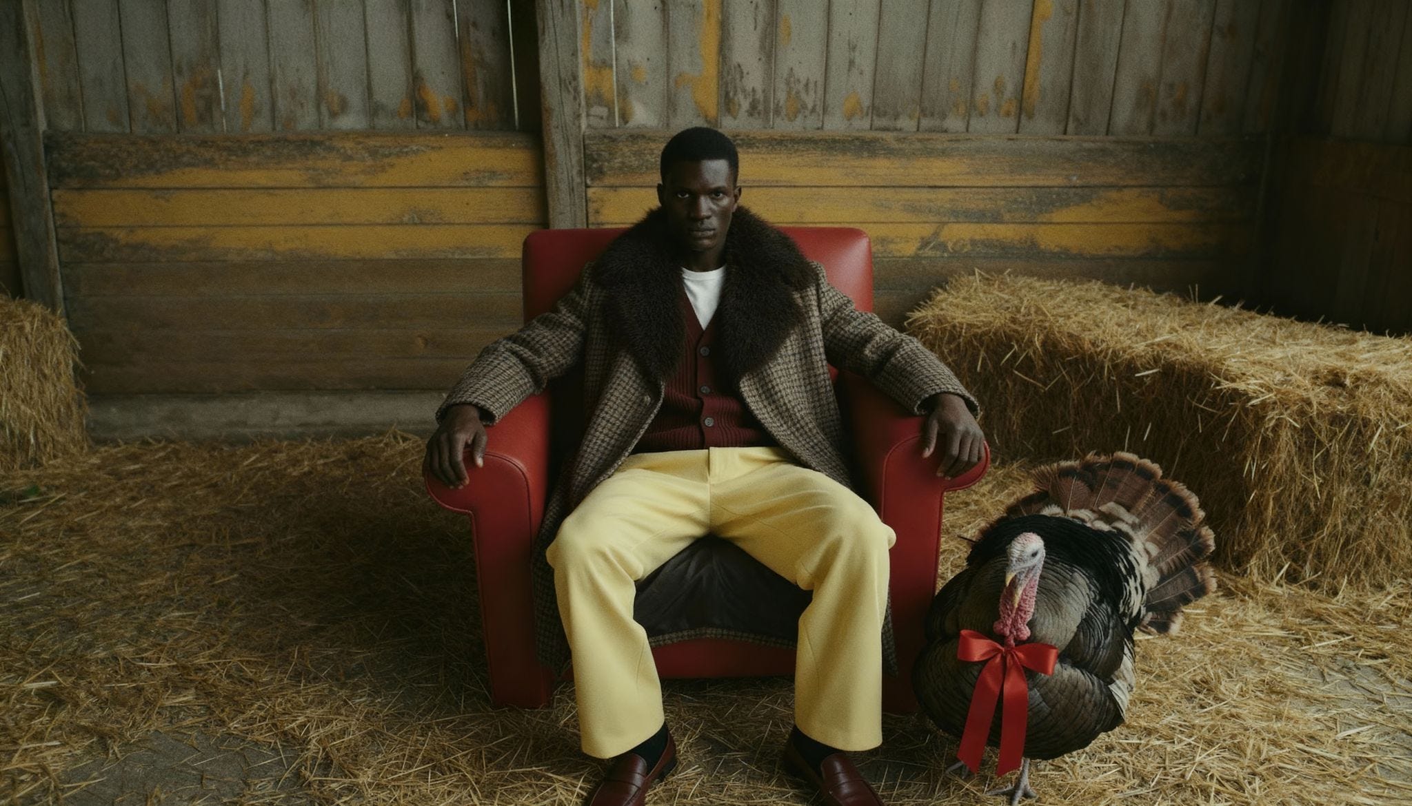 What the images reveal is a sustained commitment to what might be called rural fable logic: a world where a red leather armchair belongs in a barn, where a turkey with a bow becomes a co-protagonist, where a cabbage field is as valid a backdrop as any studio cyclorama. The casting carries it hieratic presences, frontal gazes, expressions that offer nothing but demand everything. Emotion lives in the silence between pose and prop, not in the face.
