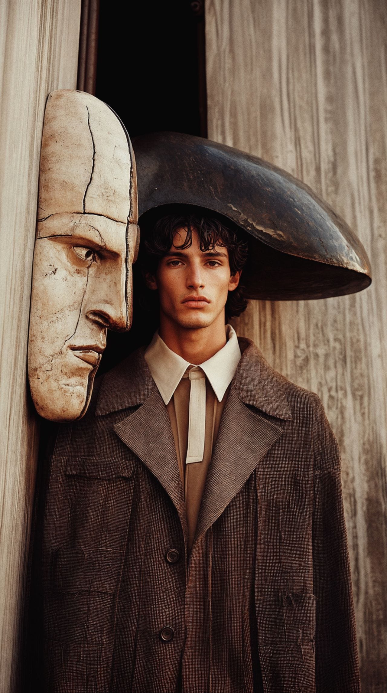 This is camp fashion with a dry sense of humor, surrealisme éditorial in the tradition of the found object reinterpreted, and European slow cinema folded into a single frame. High fashion in the key of rural fable: a sober surrealism, autumnal in palette and hieratic in gesture, where the everyday becomes symbol and humor enters wearing gloves.