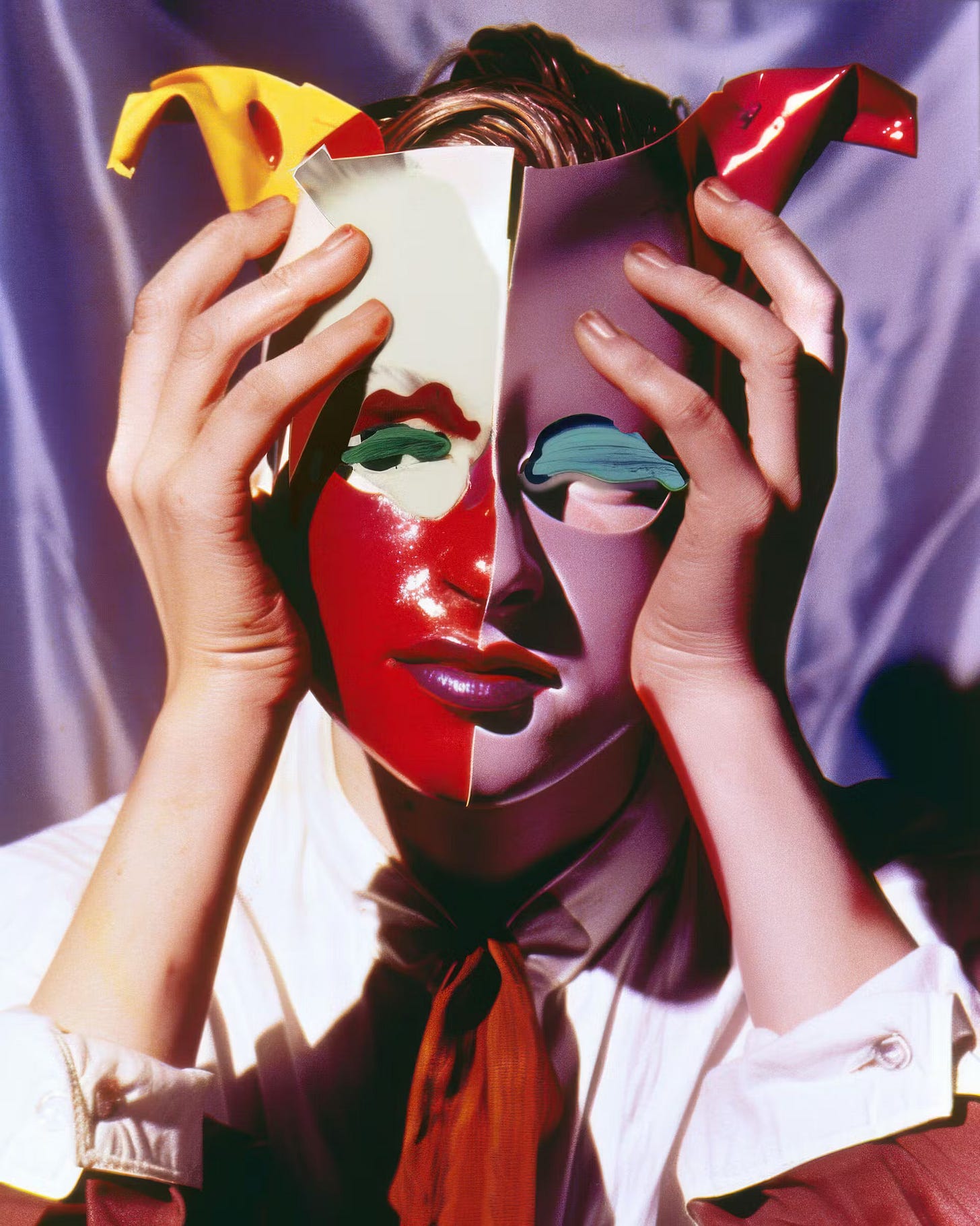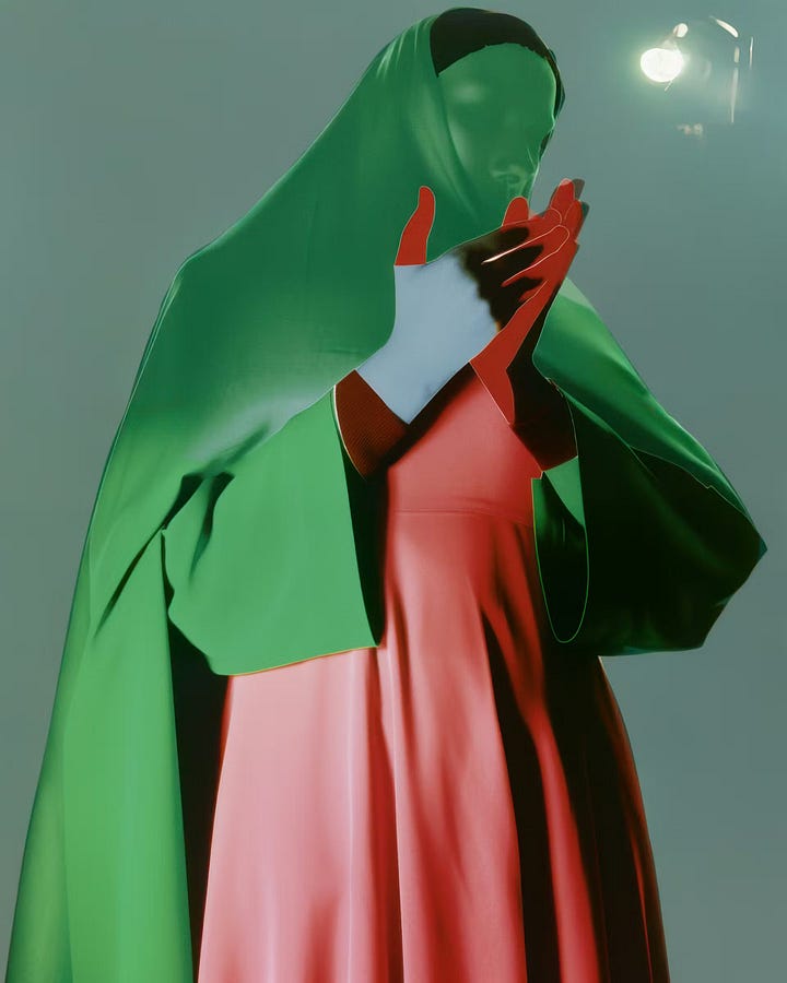 Condo’s background in film and photography operates as directorial training applied to generative output. She describes the process as choreography, moving through iterations until something sparks — that quiet recognition signal indicating “that’s it, that’s me.” The work isn’t about technical mastery but sustained conversation with the machine, prompting and refining until algorithmic suggestion aligns with authorial intent. Each image functions as film still extracted from narrative that exists only as implication, characters and scenes assembled through color palette and compositional framing rather than literal depiction.
