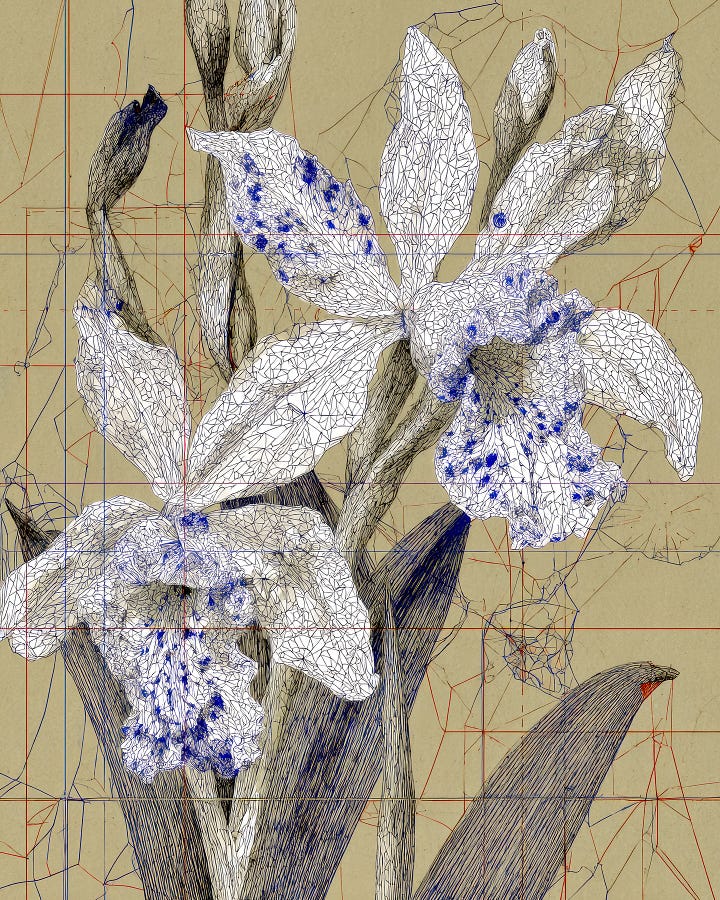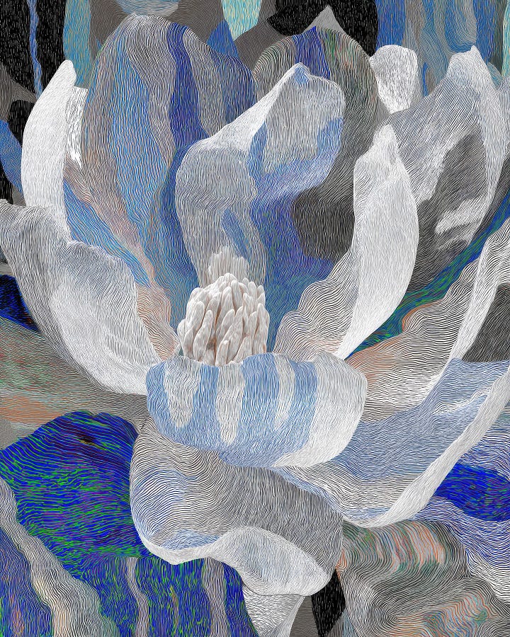 Anna Condo treats the flower as site where biology dissolves into pure structure. The Armenian-born, France-raised artist approaches botanical subjects through AI not as botanical illustration but as investigation into what remains when organic form passes through algorithmic interpretation. From 2013 to 2022, her photographic practice positioned each bloom as portrait — alive, complex, insistent on presence. Since discovering generative tools in 2022, that same obsession relocated: the flower persists, but now filtered through systems that reduce petal to line, color to code, volume to vector.